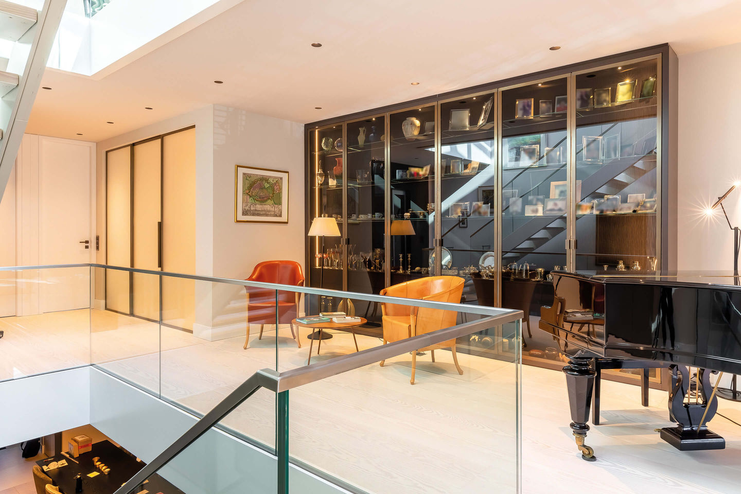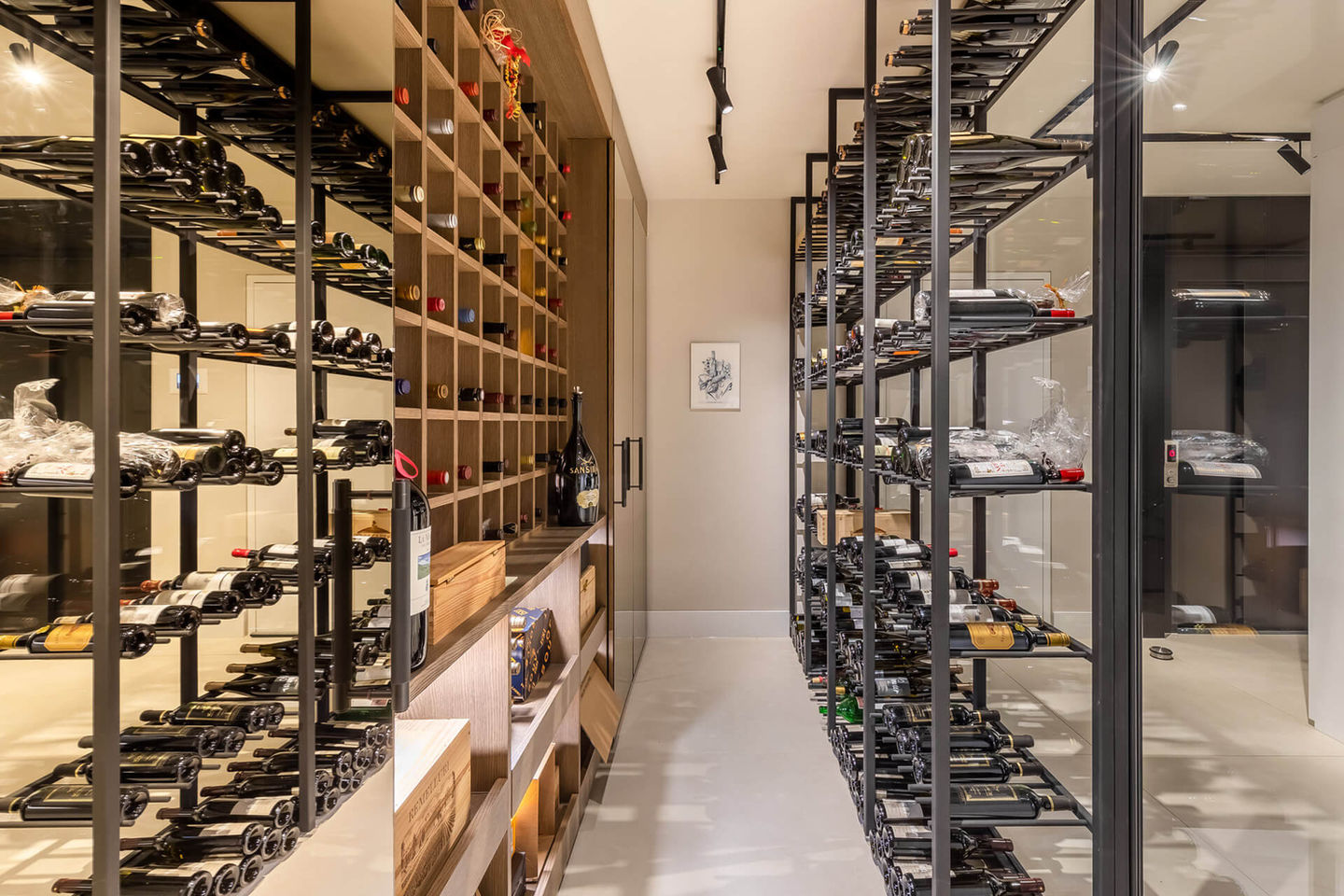 Um in das Untergeschoss zu gelangen, kann man dann ganz luxeriös mit dem eigenen Fahrstuhl den Weg abkürzen. Und dieser steht als Designmonument komplett mit schwarzem Glas eigenständig im Raum. Sehr unauffällig wurde in der Verlängerung des Aufzugsschachtes ein weiteres Staufach mit einer Glasschiebetür integriert. Und im unteren Bereich findet der Geniesser eine sehr aussergewöhnliche, begehbare Weinschranklösung im Industriestyle.